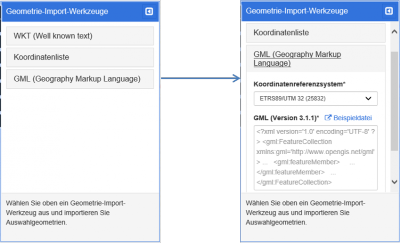 Mit der Hilfe von Geometrie-Import-Werkzeugen kann man die Auswahlgeometrie per Koordinatenliste, WKT-Polygon oder im GML-Format hinzufügen.